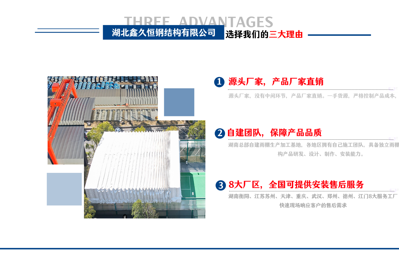 湖北鑫久恒鋼結構有限公司是一家電動雨棚、膜結構車棚研發(fā),生產銷售,施工安裝于一體的專業(yè)鋼結構科技公司,主要產品有伸縮雨棚,電動雨棚,膜結構車棚等。  湖南地區(qū)職員目前有80多人,占地面積20000平方米,廠房面積15600平方米,配備先進的生產流水線,使每件品質產品的堅實基礎。  公司在蘇州、天津、重慶、武漢、德州、烏魯木齊、江門均設有服務工廠,總人員共300多人,擁有專業(yè)的技術團隊,配備先進的設備和流水線生產,產能高,貨源充足,發(fā)貨速度快,服務區(qū)域廣。  移動伸縮棚適用于通道臨時倉儲、戶外運動遮陽、污水池遮蓋、能源交通、熱力化工、礦山、船舶制造及市政建設、物流、碼頭等領域的構件制作加工,成品半成品存放、倉庫、野外儀器設備操作用房等。尤其是對工廠發(fā)貨、倉儲臨時遮雨防嗮,梅雨期較長、建設周期較短的工程施工等特別適用。還可根據用戶需求量身定制、適合企業(yè)所需不同款式的產品。  我公司堅持“誠信社會為本,客戶滿意為榮”的經營理念,做到質量把控,嚴格管理,精益求精,恪守承諾。使鑫久恒逐步走向成熟,其系統(tǒng)化、專業(yè)化日趨完善。以專業(yè)的技術、科學的管理,更高的產品質量,優(yōu)良的企業(yè)信譽,真誠的客戶服務,靈活多樣的經營方式和務實創(chuàng)新的企業(yè)精神愿與社會各界攜手合作,為推動智能鋼結構建筑事業(yè)的發(fā)展而不斷努力。...